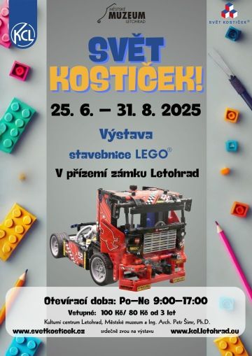 Rádi bychom pozvali všechny příznivce pestrobarevných kostiček na výstavu exponátů ze stavebnice Lego®, kterou zahájíme dne 25. června 2025. Expozičně - herní výstava pod názvem Svět kostiček! bude trvat do 31. srpna 2025 ve výstavních prostorách v přízemí zámku Letohrad.