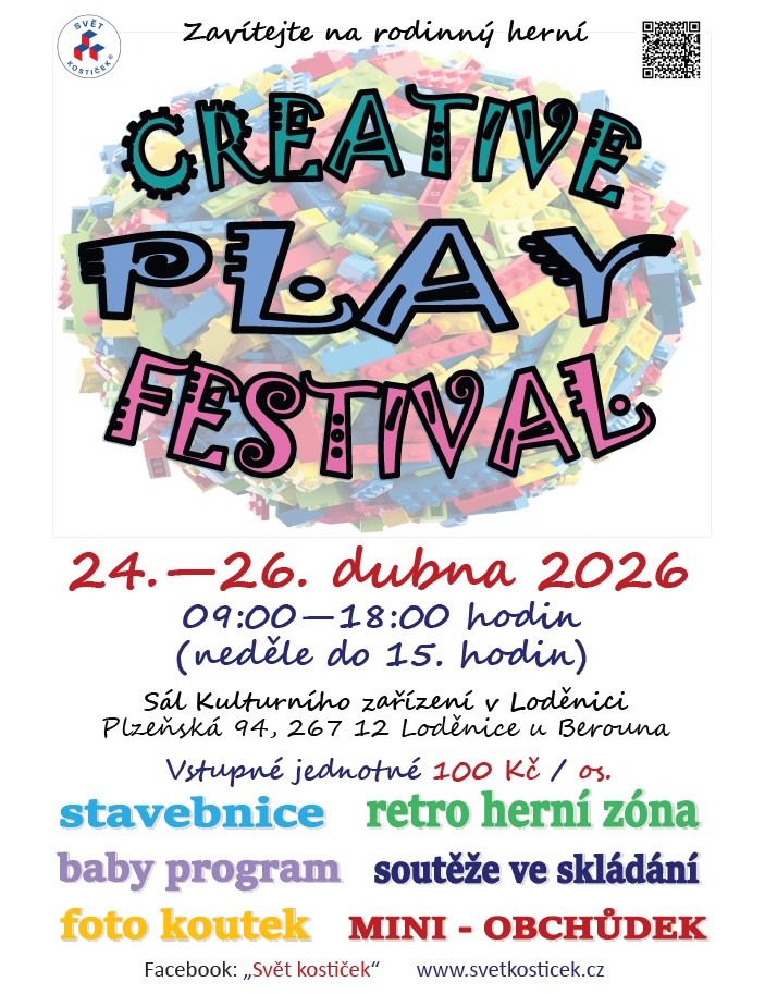 Rádi bychom pozvali všechny příznivce kreativní tvořivosti a oslav rozvoje fantazie na interaktivní rodinný herní Creative Play festival, který se uskuteční v pátek 24. 04. 2026 i v sobotu 25. 04. 2026, a to vždy od 09:00 do 18:00 hodin a v neděli 26. 04. 2026 od 09:00 do 15:00 hodin. Akce proběhne v přízemních sálech Kulturního zařízení v Loděnici (adresa Plzeňská 94, 267 12 Loděnice).
