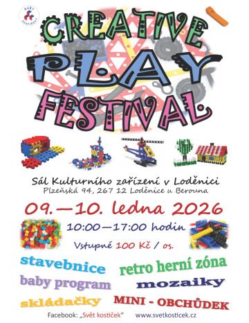 Rádi bychom pozvali všechny příznivce kreativní tvořivosti a oslav rozvoje fantazie na interaktivní rodinný herní Creative Play festival, který se uskuteční v pátek 09. 01. 2026 i v sobotu 10. 01. 2026, a to vždy od 10:00 do 17:00 hodin v prostoru sálu Kulturního zařízení v Loděnici (adresa Plzeňská 94, 267 12 Loděnice).
