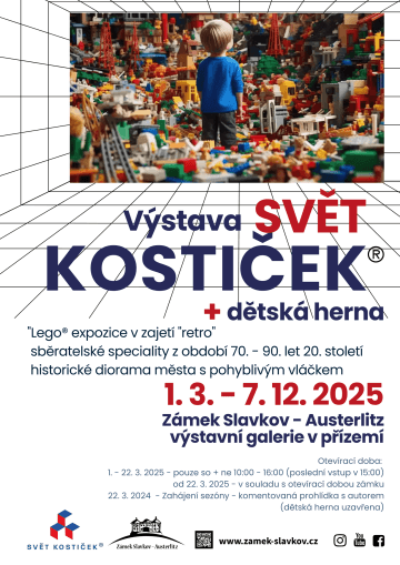 Rádi bychom pozvali všechny příznivce pestrobarevných kostiček na výstavu mnoha exponátů sestavených ze stavebnice Lego®, kterou otevíráme dne 01. března 2025, a otevřena bude pouze soboty a neděle. V sobotu 22. března 2025 bude v rámci zahájení zámecké sezóny 2025 výstavou provádět autor výstavy. Expozičně - herní výstava pod názvem „SVĚT KOSTIČEK®“ bude návštěvníkům přístupná v expozičních sálech zámku Slavkov Austerlitz v jeho otevírací době do 07. prosince 2025.